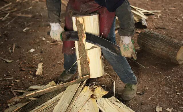 先是去树皮。工人握着长刀,两腿夹住被锯成一小段的圆木,像削甘蔗一样把树皮削掉。