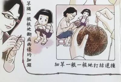 草绳一根根地撕成两条的细绳,细草一根一根地打结连接。