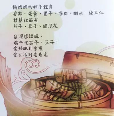 杨妈妈的粽子里有香茹、蛋黄、栗子、卤肉、虾米、绿豆仁;礼篮里面有茄子、豆子、绣球花。