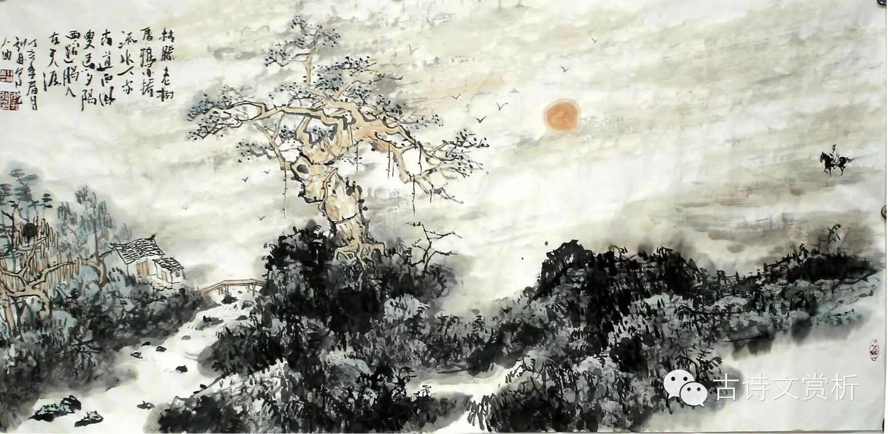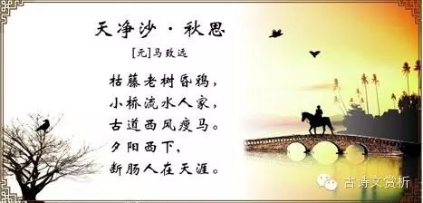 再看他的布景:“又是黄昏,一天快要结束。夕阳斜挂在山头欲落还留的样子,依依不舍得完成了一天的使命。眼前的景色真是满目凄凉,藤是枯萎的藤,已经没有了生命。树是千年老树,飒飒的西风在吹着它走向风烛残年。道是荒凉的古道,马是体弱无力的瘦马。飘零在天涯海角的人,面对如此萧瑟的景色怎么能不断肠呢。你看这小桥、流水、人家都是那么安详,那么静謚。又是那么温馨。而我的家乡、亲人却又离我那么远。哦,他们还好吗?天气渐渐变冷,他们加了衣服吗?买了被子吗?这一切的一切是都么让人牵挂。既然那么让人牵肠挂肚,我为什么不早点回去呢?为了所谓的前程吗?为了那所谓的功名吗?那功名离我近吗?远吗?京城的路还有多长呢?我又是那么的迷茫。在这样的黄昏中,在这样的古道上。又是这样萧瑟的季节。我是继续去追求功名呢?还是会去服侍那年老的双亲呢?我自己也不能回答自己。只好满怀愁绪徘徊在漫漫得古道上了……。”如此萧瑟的景色让人满目凄凉,又加上安详,温馨的小桥、流水、人家做反衬,使愁情更为深切,悲伤更为凄沥。写景之妙尽妙于此也!