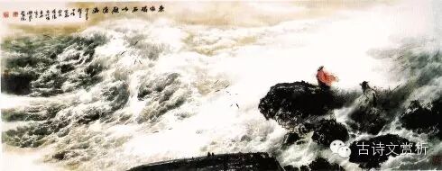 “水何澹澹,山岛竦峙。”是写从碣石山往下看沧海的情形。“澹澹”,是形容海水摇摇晃晃的样子;“何”,这里当“多么”讲。“水何澹澹”,写出了大海涌起阵阵波涛,显示了大海的力量和宏伟气象。其中有惊讶,有赞美,正是刚刚登上山顶的第一个印象。“竦峙”,是高耸屹立的样子。这两句诗的意思是说:茫茫的大海上碧波万顷,一望无垠,只有脚下的山岛高高地耸立在海心。我们都知道,同样是观海,站在岸边,坐在船头,或者是登上山顶,我们的感受是很不相同的。曹操这时候站在山上,第一眼看到的自然是大海的全景。所以他从大处落墨,着力渲染大海那种苍茫浑然的气势,给人一种坚定倔强的感觉。山岛巍然,一下子就夺去了诗人的注意,所以紧接着就写岛上的景色:“树木丛生,百草丰茂。”充满了一片欣欣向荣的景象,仿佛其中有无限的生趣等待我们去发现。“秋风萧瑟,洪波涌起。”随着一阵萧瑟的风声,突然涌起了滔天的波澜,使人觉得惊叹都有点来不及呢!可是等我们掉转视线,去看那涌起的洪波的时候,诗人却不再描写下去了。