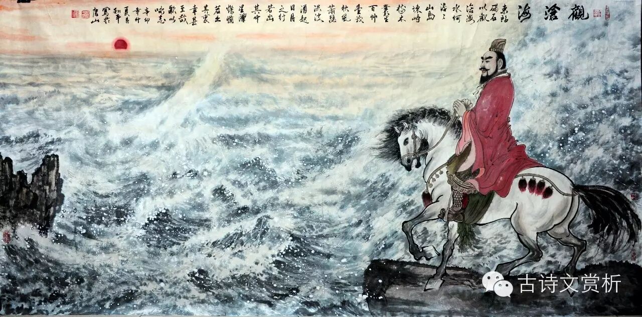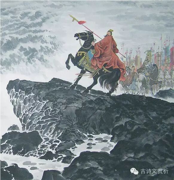 “东临碣石,以观沧海。”开篇点题,交代了观察的方位、地点以及观察的对象。这两句虽然没有直接写到人,但我们仿佛看到了曹操登山望海时的那种勃勃英姿。“碣石”,据《汉书·地理志》载,在丽城(现在河北乐亭)西南,六朝时沉入海里。“观”字统领全篇,是诗的线索,以下由“观”字展开,写登山所见。