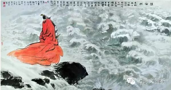 首二句“东临碣石,以观沧海”,写诗人于挥师北伐之际来到碣石山下,登高观海。碣石山原位于今河北省乐亭县西南(一说在今河北省昌黎县西北),汉时还在陆上,面对着渤海,六朝时由于地质变动,沉于海中。诗人登上碣石山,俯视大海,只见的:“水何澹澹,山岛竦峙”。澹澹,水波动荡。竦峙,岛屿高耸的样子。诗人登高远眺,举目所及只见一望无垠的大海波摇浪涌,海中的岛屿高高矗立。这是多么辽阔、多么壮观的景象!在历史上,秦始皇、汉武帝都曾东巡至此,刻石观海。如今诗人站在秦皇、汉武游踪所到之处,居高临下,望着水天相连的苍茫大海和海中高耸的岛屿,想到中原地区已经平定,北伐乌桓也已取得决定性胜利,北方统一即将实现,心情该是何等激奋!这时,诗人的目光注视着海上的岛屿,眼前是一派生机盎然的景象:“树木丛生,百草丰茂。秋风萧瑟,洪波涌起。”树木百草,生长十分繁茂,一阵萧瑟的秋风吹过,海面上涌起滚滚的波涛。尽管萧瑟的秋风给人以悲凉萧杀之感,但是疾风劲草,方显其英雄本色;洪波汹涌,愈见其生命不息!这是对自然环境的真实描绘,也是诗人主观感受的具体写照。曹操在取得一连串的战争胜利之后,他觉得自己的雄图伟业犹如这树木百卉一样,生机勃发,也为这洪波涌起的大海,充满生命的活力。以下,诗人又展开其丰富的想象,进一步描绘了大海吞吐日月、包蕴星汉的宏伟气魄和博大胸怀。“日月之行,若出其中;星汉灿烂,若出其里。”日月的运行好像出没于大海的怀抱之中,灿烂的银河群星好像包孕于大海的母腹之内。请看,这就是大海的气魄,大海的胸怀。真是太壮观、太奇伟了。《观沧海》是一首写景抒情诗。诗人勾画了大海吞吐日月、包蕴万千的壮丽景象,表现了开阔的胸襟,抒发了统一中原建功立业的抱负。虽然其中并无直抒胸臆的感慨之词,但是诵读全诗,仍能令人感到它所深深寄托的诗人的情怀。通过诗人对波涛汹涌、吞吐日月的大海的生动描绘,使我们仿佛看到了曹操奋发进取,立志统一国家的伟大抱负和壮阔胸襟,触摸到了作为一个诗人、政治家、军事家的曹操,在一种典型环境中思想感情的流动。全诗语言质朴,想象丰富,气势磅礴,苍凉悲壮,为历代读者所激赏。沈德潜在《古诗源》中评论此诗“有吞吐宇宙气象”。这是很精当的。