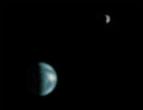 上图是2003年NASA的火星探测器在火星上拍到的地球及其卫星月球。虽然模糊,但部分的南北美洲和太平洋还是可以看见。