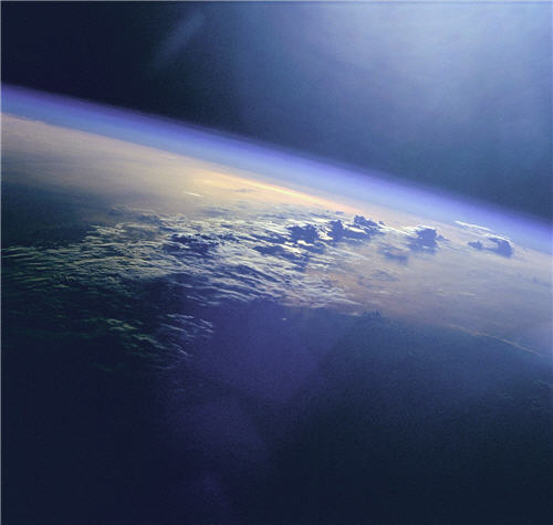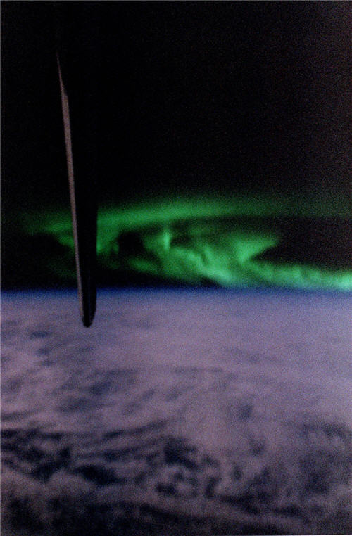 上图是NASA科学家John Phillips于2005年6月17号在远征11号拍摄的,当时远征11号刚好超越月球的地平线,拍摄对像是飓风Emily消失于尤卡坦半岛的加勒比海沿岸的情景。