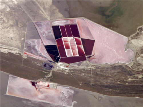 上图是由国际空间站拍摄的,拍摄对像是非洲主要生产纯碱的盐池(红色)。