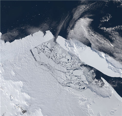 上图是由于 NASA的Terra卫星提供的数据模拟出来的图像,显示的是Wilkins冰块大陆架出现橙色的情景。