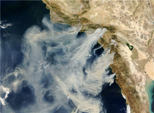 上图是特拉卫星在2003年10月26号拍摄的美国加州南部的森林大火,看似是云的其实是大火而成的烟。