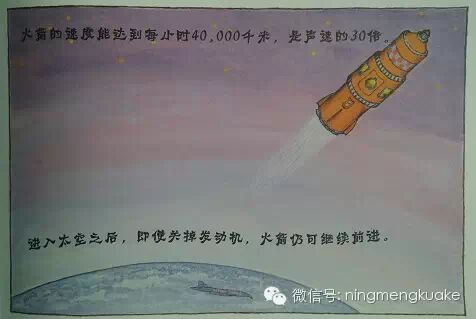 如果需要飞到月球上去,那就意味着要摆脱地球引力,这就需要更快的速度。火箭的速度要比喷气式飞机快多了,可以达到每小时40000千米,是声速的30倍。
