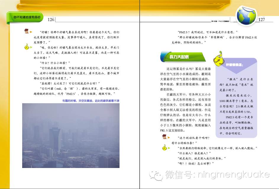 柠檬:“它们叫霾(mai,念‘埋’)。霾的大军里,有一股超迷你、超精锐的特种别动队,代号‘PM2.5’,杀伤力极强,超级可怕!”