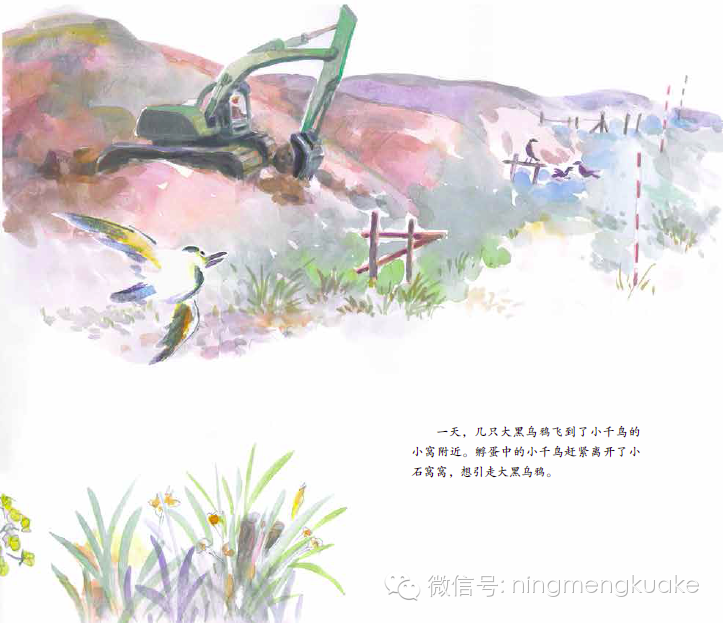 更有几只大黑乌鸦飞到小千鸟的窝的附近。孵蛋中的小千鸟赶紧飞离小窝,想引走大黑乌鸦。