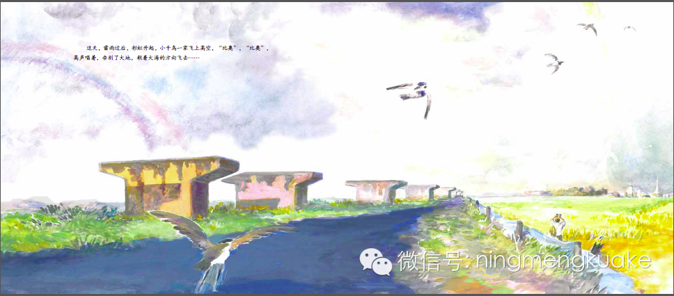 这天,雷雨过后,彩虹升起。小千鸟一家飞上高空,“比奥,比奥”高声唱着,告别了大地,朝大海的方向飞去。
