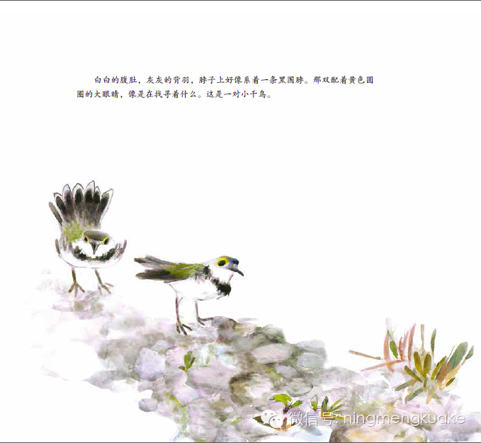 白白的肚腹,黑黑的背羽,脖子上好像系着一条黑围脖。那双圆圆的大眼睛,好像在找寻什么。这是一对小千鸟。