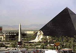 型的玻璃金字塔主体建筑加上一个花哨版的狮身人面像的酒店大门成为旅客的必游之地。夜幕降临之时,金字塔顶端一束强光直冲云霄使得整个建筑仿佛在庄重地诏