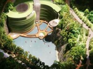 一座美轮美奂的超五星级酒店,建在周长千米、深近百米的大坑之内。坑底为一汪碧波,坑壁还挂有漂亮的百米瀑布。一架观光直升飞机不时在深坑停机坪起降,在深坑上空来回穿梭。