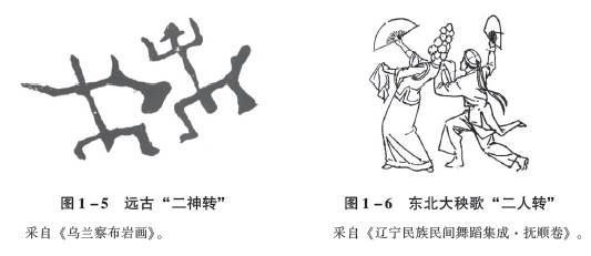 当我们把当代二人转的造型姿势与红山文化及其相近区域远古岩画图像表现的男女对舞姿势进行比较的时候,我们非常惊奇地发现了两者的一致性。这种一致性是一个不可否认的事实。我们很难在二人转之外的戏曲、曲艺或戏剧中看到这种现代舞蹈与史前舞蹈造型姿势相一致的奇观。这种一致性表现了一个艺术的秘密:二人转很可能是史前舞蹈姿势的当代“遗留物”。