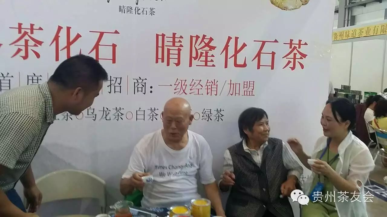 图为贵州省省农委胡继成主任(左一)莅临“晴隆化石茶”展位指导工作,“晴隆化石茶”负责人王小霞总经理(右二)认真汇报工作。