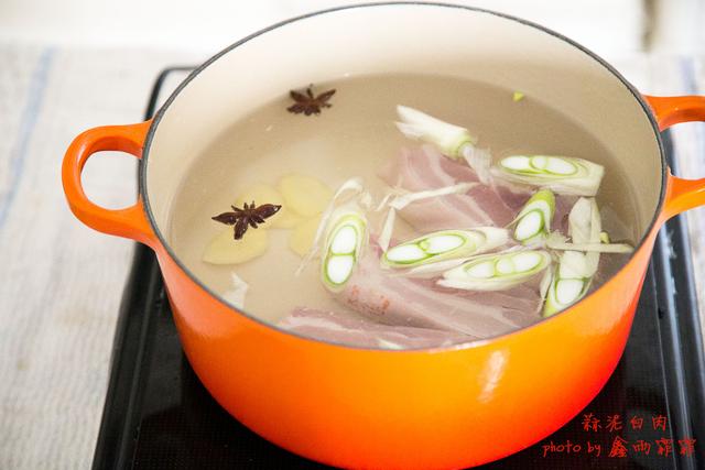 2、葱、姜切片,五花肉洗净冷水入锅,加入葱姜片、料酒和八角大火煮开。