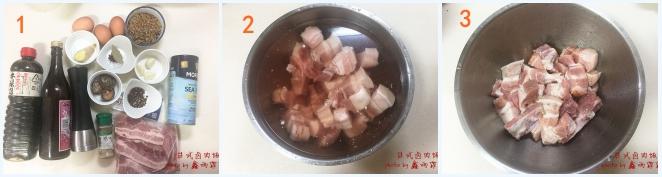 材料:五花肉500g 红葱酥 一小碗 鸡蛋三个 干香菇三朵 日式酱油适量 料酒一碟 米酒适量 蒜三瓣 生姜一块 花椒适量八角一个香叶两片 冰糖两块 盐适量