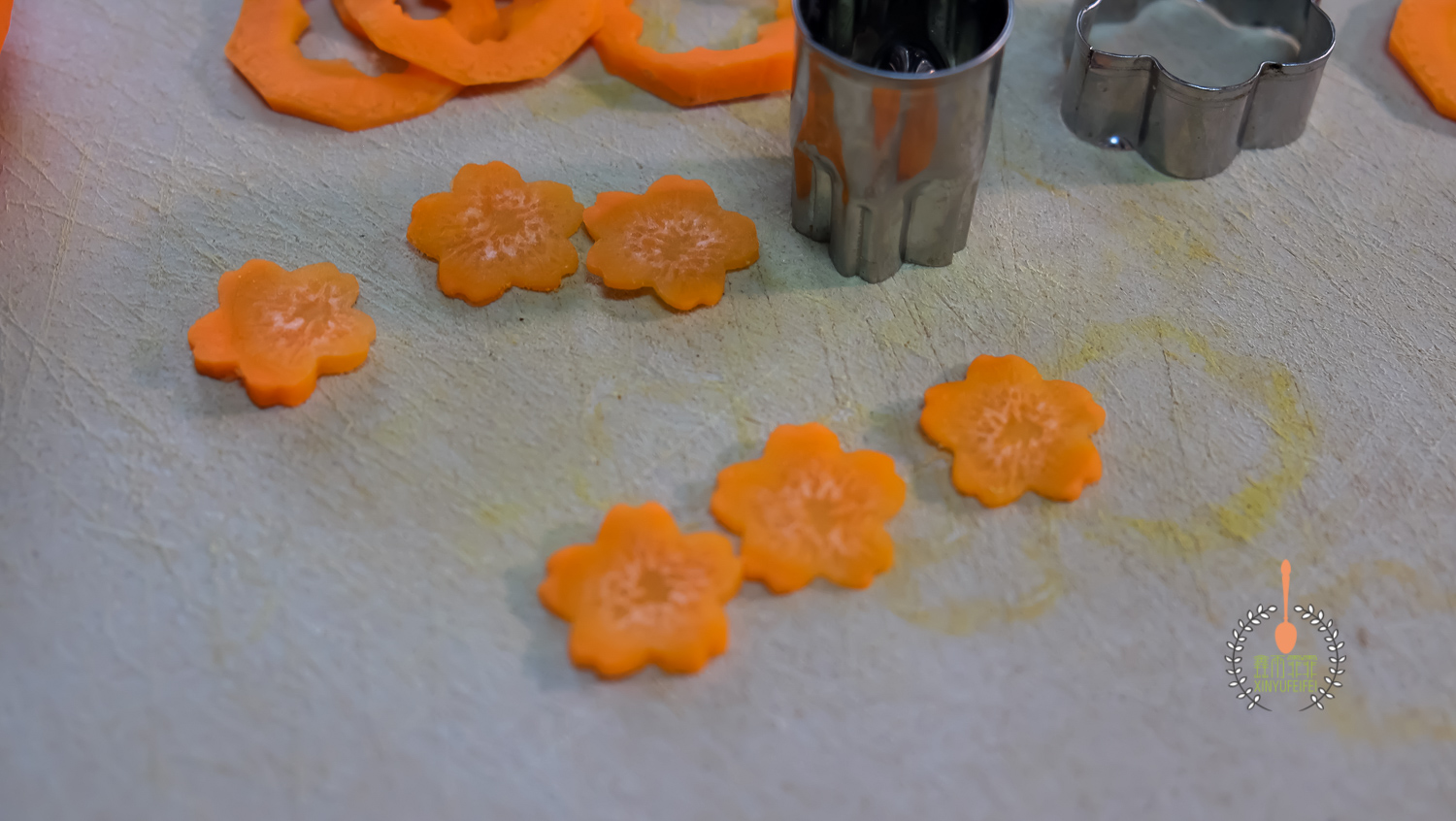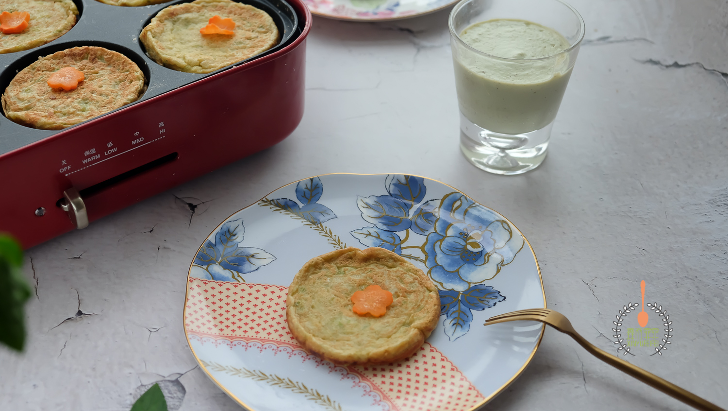8.3分钟以后面糊凝固,在翻面烙三分钟将胡萝卜花放到面糊上,上色后就可以了。