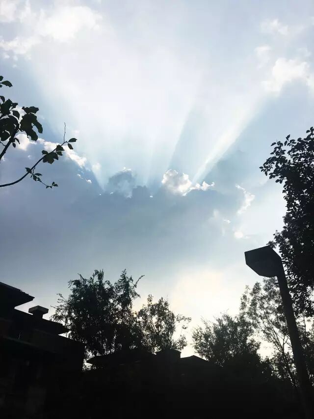 阳光透过云层散射出来,云朵仿佛镀上一层神秘的光~好仙!