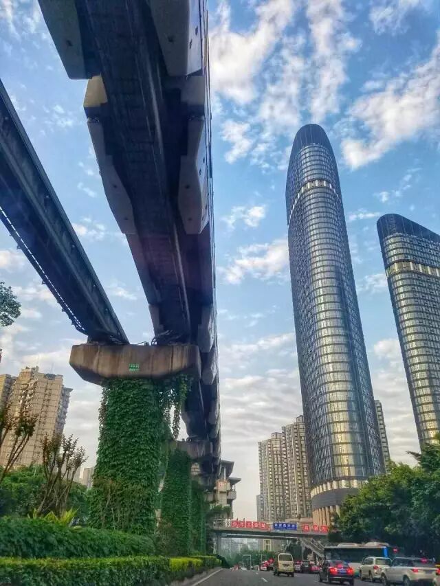山城的魔幻在蓝天白云的映衬下,线条变得柔和梦幻~
