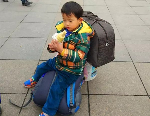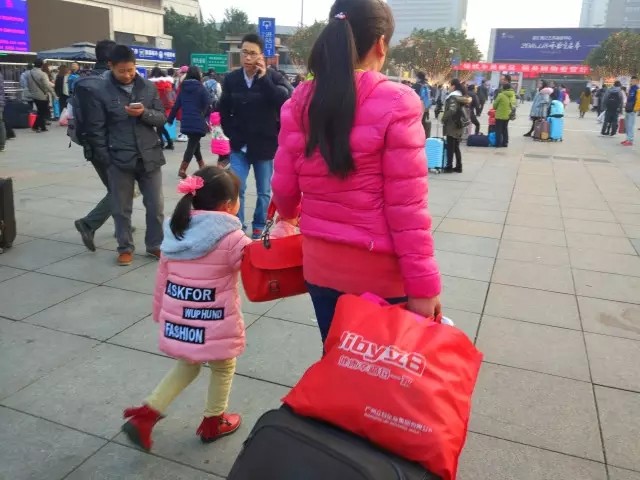 ▲也有妈妈一手牵着孩子,一手拎着行囊,想必家里的老人想孙子想疯了吧。
