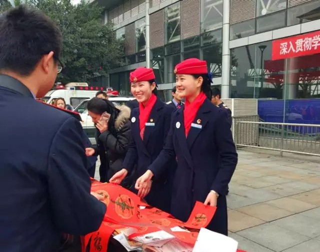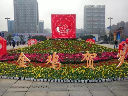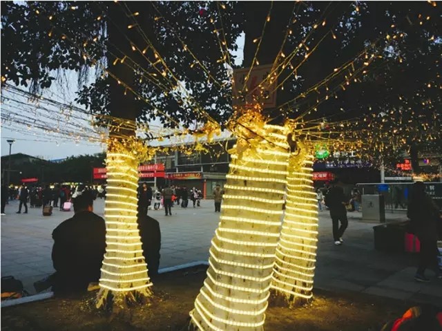 ▲天空还露着鱼肚白,早晨干燥而阴冷,广场上矗立着金黄的大字“金鸡贺岁”,树干上装饰着bling bling的霓虹灯,客运段工作人员送着春联,到处洋溢着过年的喜庆。