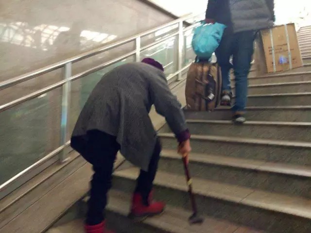 ▲在人群中,一位老奶奶走了出来,她独自拄着拐杖,身旁无人陪伴。市锅在旁边跟了她一段,她艰难地爬上楼梯,本来就佝偻的背仿佛快要着地。再艰难,也要回家。