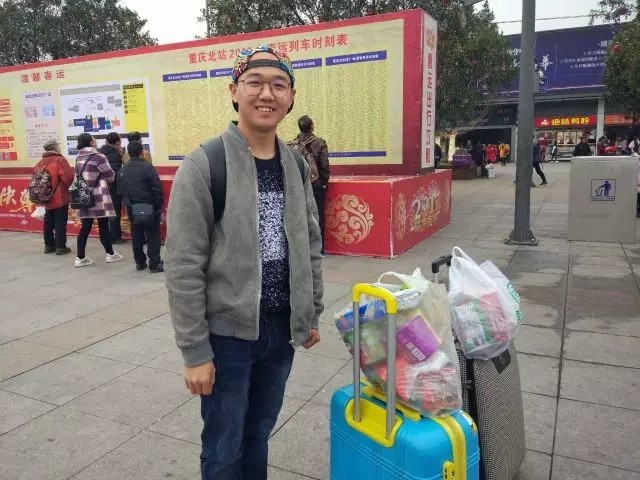 ▲一个在合川读大学的同学,家住在山西,距离1142公里。来重庆已经三年了,说着一口流利的重庆话,而此次的前行并不是回家,而是和其他两个同学去苏州打工。已经大三的他面对我们的镜头的时候还略显青涩,但他已经开始跨入这个社会,开始成长起来。这虽然是一个不能和家人团聚的新年,但照片中的他笑得十分开心,这大概是成长与拼搏的笑容吧。
