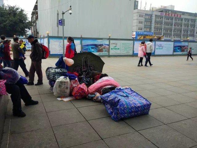 ▲各式各样的行囊占满了整个广场,很多人要坐十几小时甚至二十小时的车才能到家,这里面必然装着他们带给家人的礼物,或许是孩子的玩具,或许爸爸妈妈的新衣服,或许……今年,你带给家人的礼物是什么呢?
