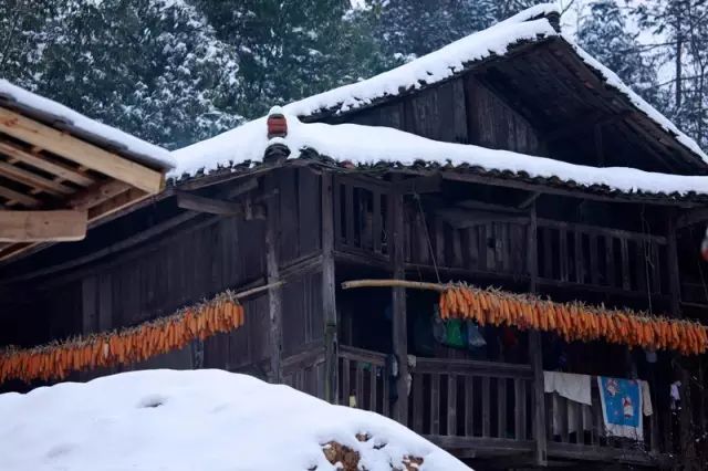 八龙村是土家族集居的山寨,这里全是面貌一新的巴渝新居,吊脚楼、木格门窗,家家户户悬檐下,悬挂着一排排金黄色的玉米棒,一串串火红的红辣椒,在雪地山寨格外醒目。漫步山寨,欣赏边寨风情,如同置身世外桃源。
