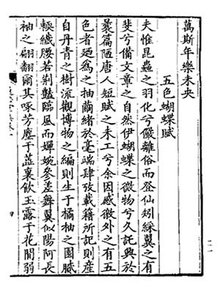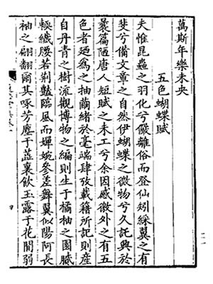 夫惟昆虫之羽化兮,俨离俗而登仙。矧彩翼之有斐兮,备文章之自然。伊蝴蝶之微物兮,久托兴于曩篇。陋唐人短赋之未工兮,余因感徼外之有五色者,乃为之抽茧绪于毫端。肆考载籍所记,则产自丹青之树;流观博物之编,则生于橘柚之园。腻软纤腰,若荆艳临风而婵婉;参差舞翼,似阳阿长袖之翩翻。尔其啄芳尘于蕊里,饮玉露于花间。弱比收香之么凤,清同翳叶之寒蝉。柳院儿童,解惜轻须除细网;兰闺窈窕,最怜新粉扑齐纨。双飞款款,并戏娟娟。所由荡子之妻,见悠扬而兴惋;怀春之女,对夹拍而含酸者也。