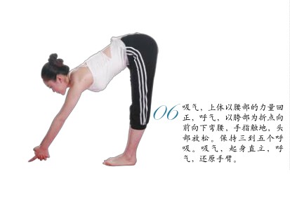 理疗功效:可消除腰围线上的多余脂肪,补养增强脊柱的下段、双髋以及腿部肌肉。在弯腰的过程中,使肠脏活动增强,可强壮神经系统,帮助消化和排泄过程,并有助于消除肠胃问题。