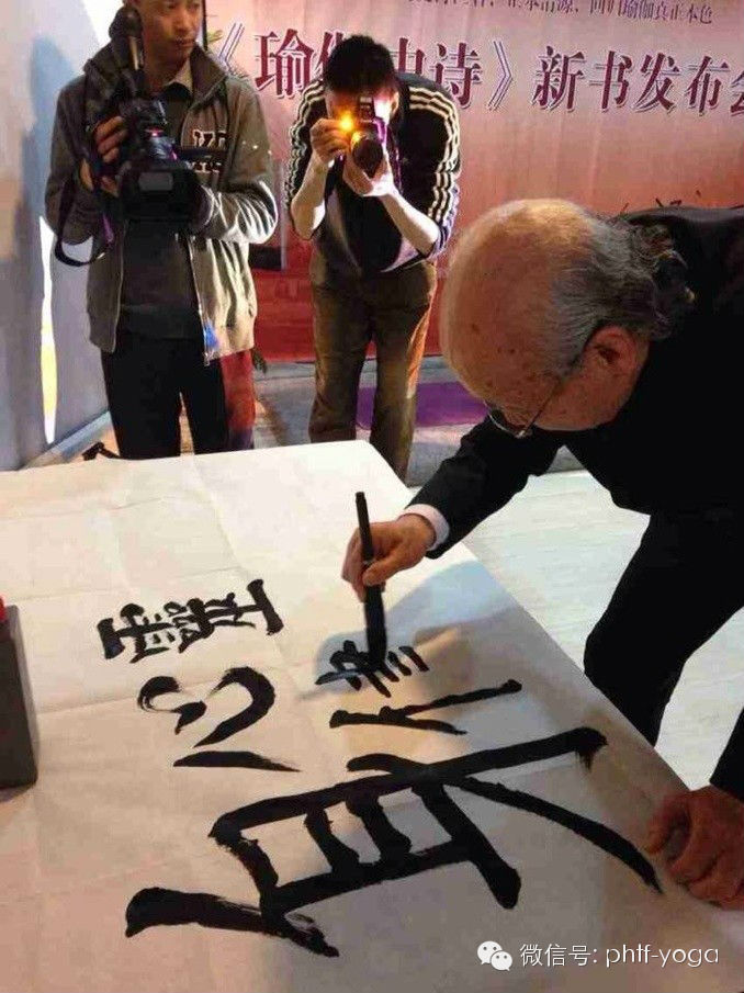 王老先生在为我们提笔写字,“身心灵中国,健康瑜伽”是,我们就是要走出一条中国瑜伽发展之路,感谢王老的题字!