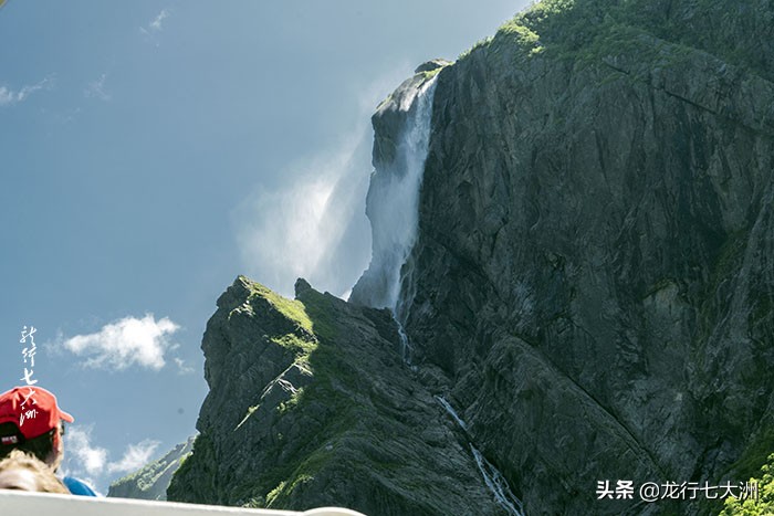 乘船非常舒适,船开的不快,沿着“西溪峡湾”向东行驶,秋风习习非常凉爽,两边的高耸的峭壁和瀑布让人目不暇接。最吸引我的是那高山飞瀑,层层叠叠的瀑布从2000英尺高的悬崖峭壁上飞泻而下,水雾在空中飘洒,在眼光下闪着耀眼的光芒。瀑布的水流穿过布满绿树的山涧泄入湖中。