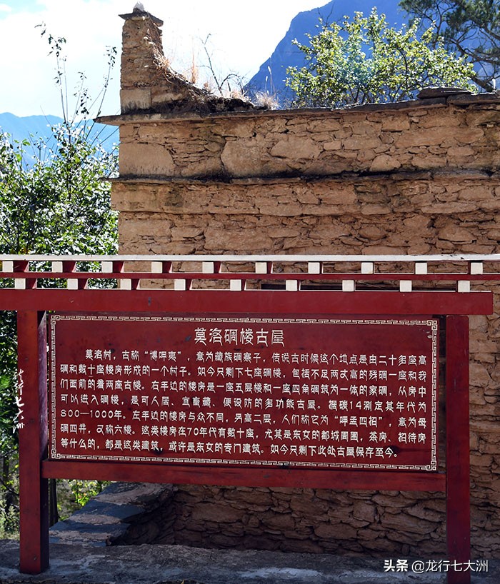“莫洛碉楼古屋,莫洛村,古称“博呷夷”,意为藏族碉寨子,传说古时候这个地点是由二十多座高碉和数十座楼房形成的一个村子。如今只剩下七座碉楼,包括不足两丈高的残碉一座和我们面前的这两座古楼。右手边的楼房是一座五层楼和一座四角碉筑为一体的家碉,从房中可以进入碉楼,是可人居、宜藏、便设防的多功能古屋据碳14测定其年代为800—1000年。左手边的楼房与众不同,另高二层,人们称它为“呷孟四”,意为母碉四井,可称六楼。这类楼房在70年代有数十座,尤其是东女的都城周围,茶房、相待房等什么的,都是这类建筑,或许是东女的专门建筑。如今只剩下此处古屋保存至今。”