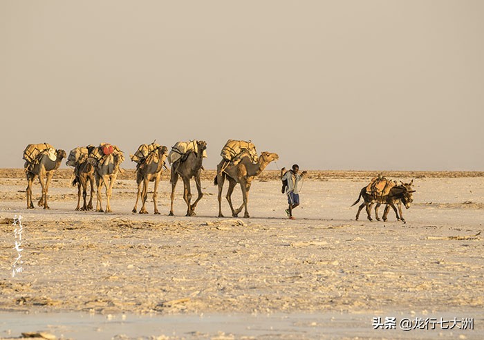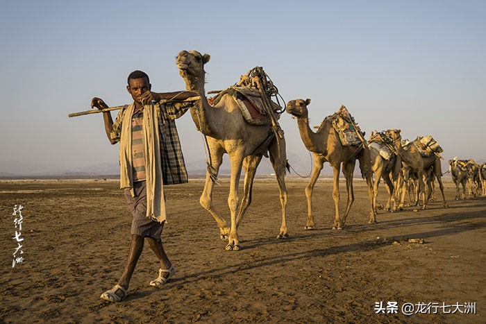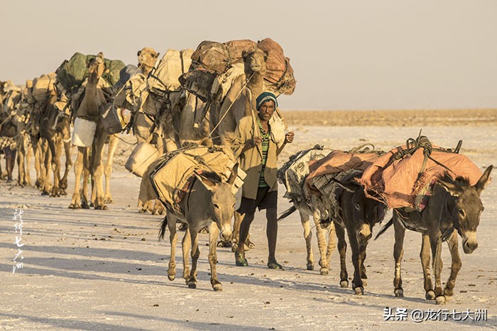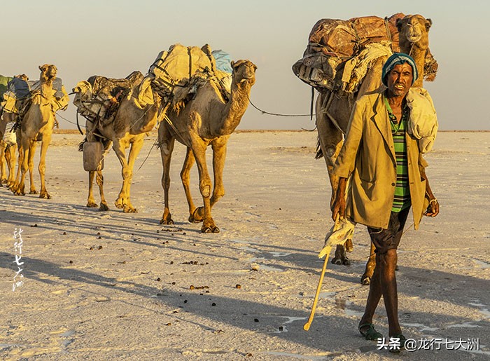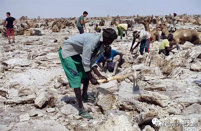 达纳吉尔盐场上,阿法尔人把这些既坚硬又易碎的盐块削切得方正规整,以保证在长途运输中盐块的完好无损。据说从古希腊时代起,居住在埃塞俄比亚高原的人们便赶着骆驼,年复一年地走进这片令人生畏的大火炉,寻找宝贵的盐。至今,驮盐人仍在几百年来骆驼踏出的小道上日复一日地跋涉,采盐和驮盐的方式也几乎没有任何改变。