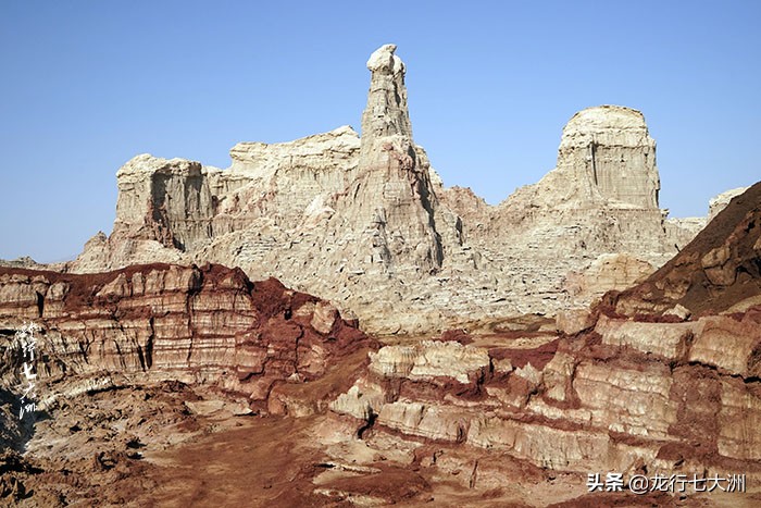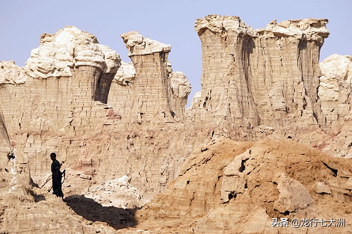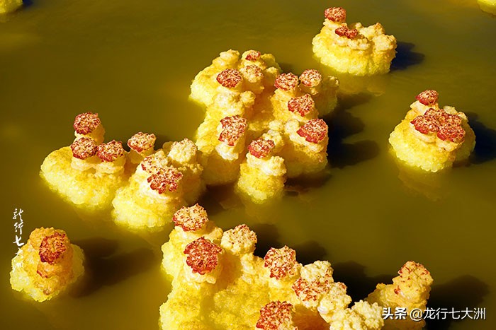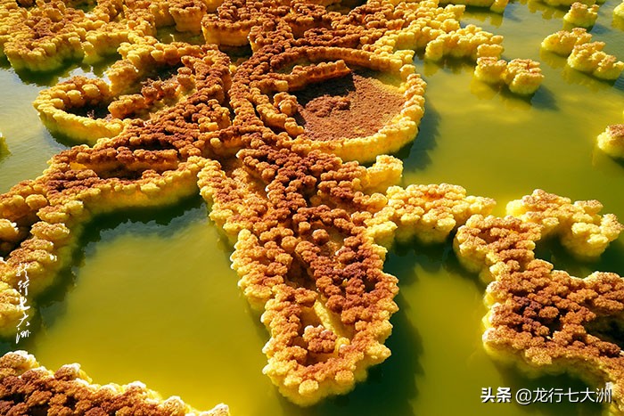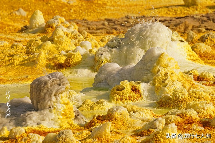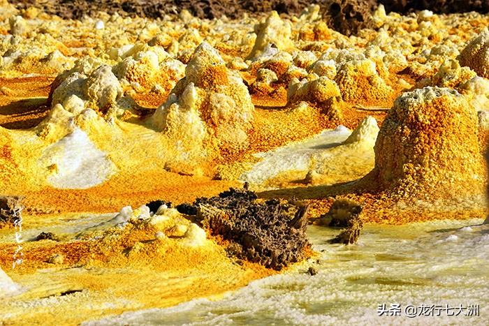 黄昏,成群结队的骆驼穿过盐湖,阔步走进天边地平线的雾霾中;夜晚,沸腾的火山点亮了夜空;阳光下,硫磺土堆形成了超凡脱俗的形状,这就是达纳吉尔凹地的景象。