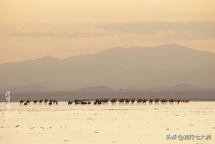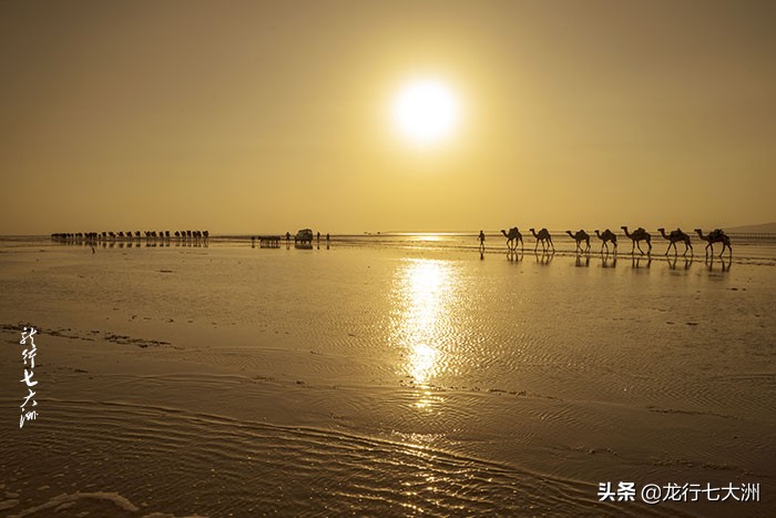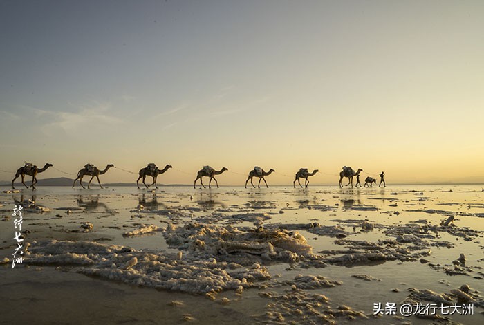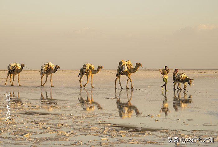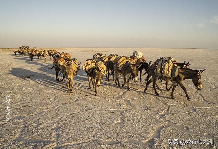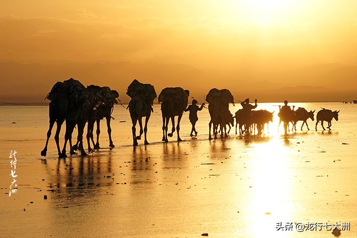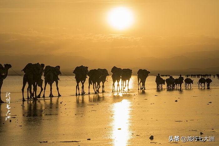 Karum盐湖海拔-120米,这里的水含盐量极高,是埃塞的主要产盐区。每天有几百头骆驼和毛驴的运盐大队从盐湖边把盐块运到Hamedela,再运往埃塞各地。黄昏,运盐队伍浩浩荡荡穿越盐湖的景色非常壮观!我整个下午都在盐湖拍照,直到日落团队返回村庄。