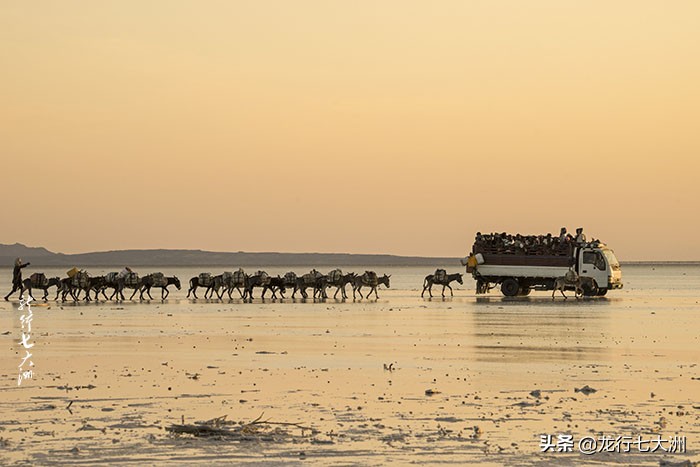 早上6点用过早餐后,我们又穿过盐湖,去彩色盐湖Danakil。盐农也迎着朝阳出发去盐湖。