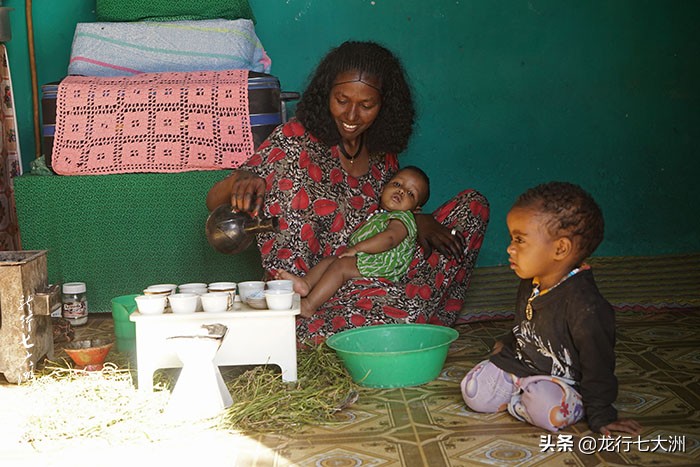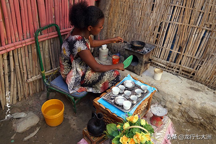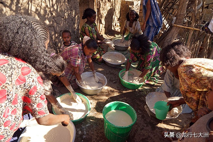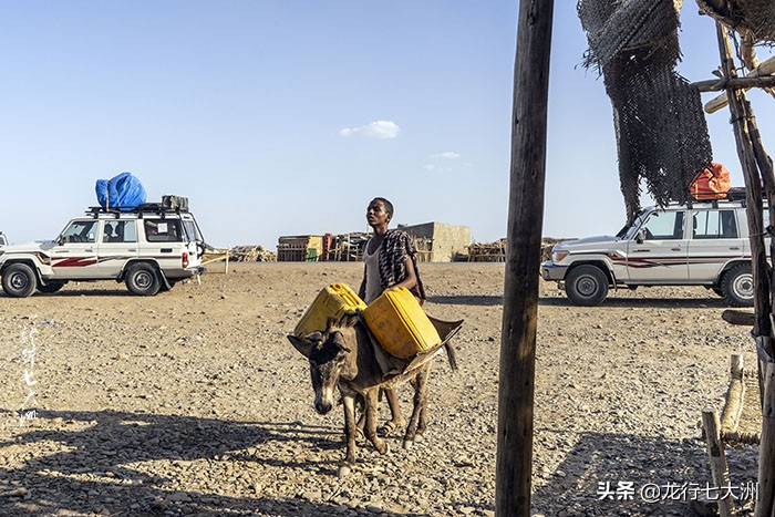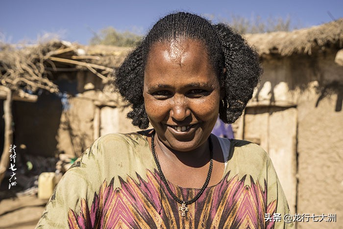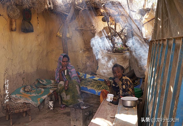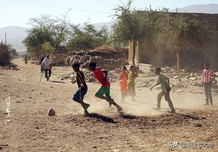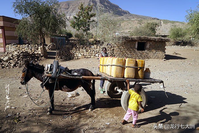 确定后床位,放下行李,先到村子里转转。这是一个提格雷人(Tigray)聚集的村子,几个孩子在街口踢足球,弄得街口尘土飞扬,这是可简易获得的娱乐方式;两个妇女在自己的棚子里享受咖啡的美味;一个小院里,一群妇女在厨房忙活着,提格雷妇女独特精美的发式让人过目不忘。路上拉水的驴车上装满了黄色的水桶,说明这里离取水的水源有不近的距离。