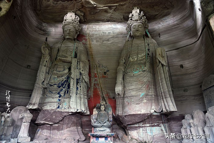 3#龛文殊菩萨造像是古代石刻造像之精品。文殊菩萨头戴五叶佛冠,身着右袒式大衣,右肩敷搭偏衫,服饰短璎珞,慈祥端庄,呈舒态状,右手置胸腹间,左手托经书外伸达1.5米,书和手的物重量有千余斤,历经千余年不坠,全靠肘下高2.2米飘逸的垂地袈裟支撑,运用力学与美学结合,造型巧妙,展示出了古代匠师们以惊人的智慧。