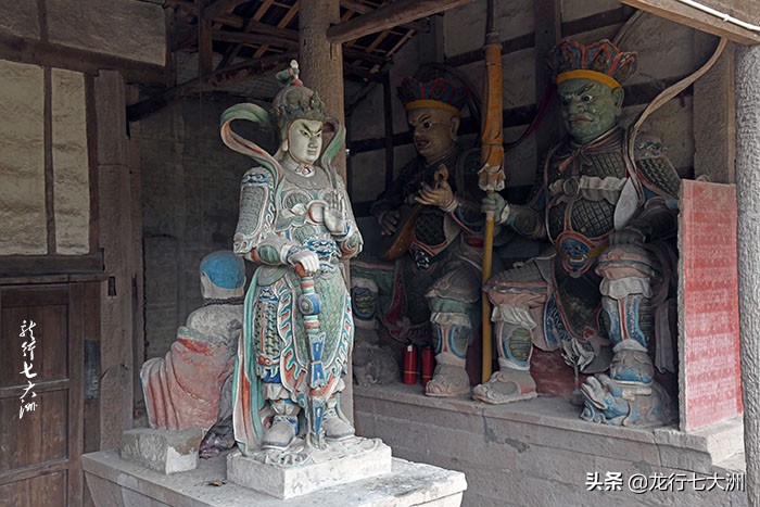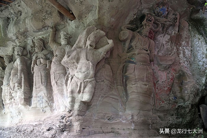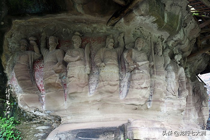 进入山门后沿山崖边的小路前行,首先看到的是护法神造像龛,龛窟依山岩凸 出之势造型呈半圆形,长9.6米,高2.3米。此龛中,集中雕刻了均高1.8米的12个护法神,他们呈站姿,顶盔贯甲,或提刀仗剑,或执鞭托杵,或昂头远眺,或怒目圆睁,或剖胸见心,或捏拳欲动,人人威武雄健,个个虎视耽耽,真心守卫佛祖,虔诚维护圣地,使人感到这里不是轻妄之处,而是神圣不可侵犯的地方。