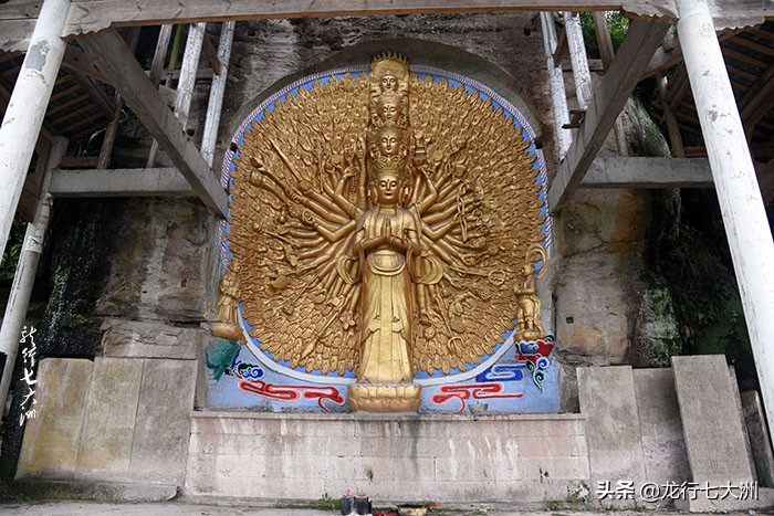 车开到近山顶了小路口只能停在那里,到达茗山寺还要往上步行300多米,临近茗山寺的路边有一尊金光闪闪的“千手观音”,是近年新塑造的。