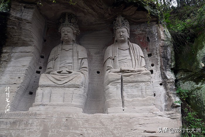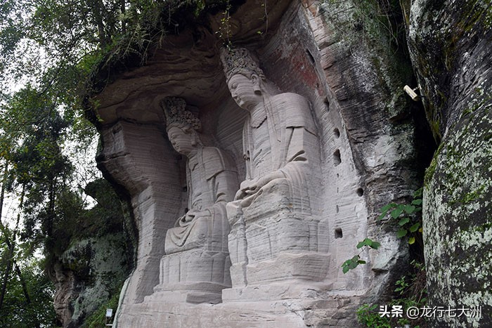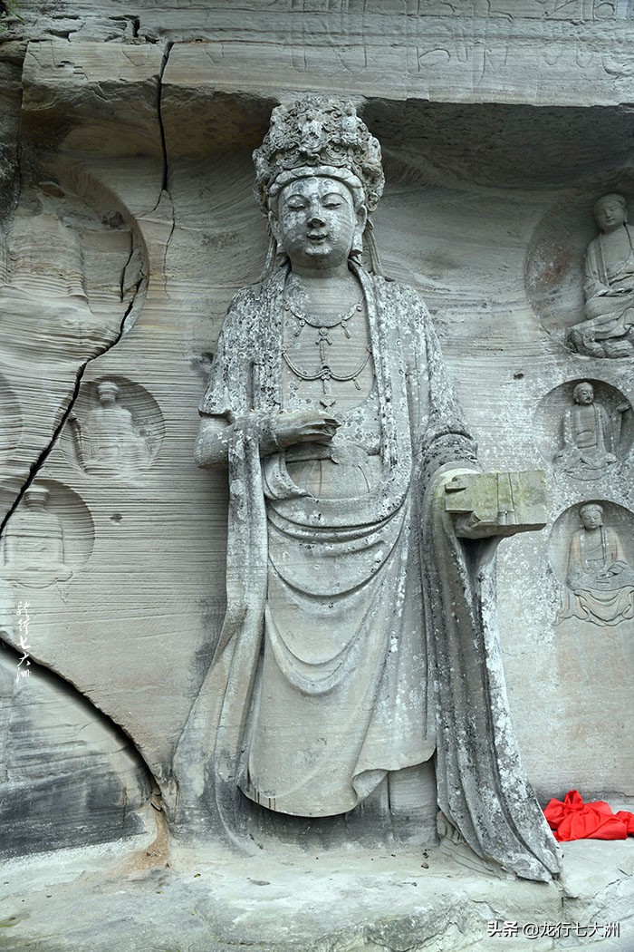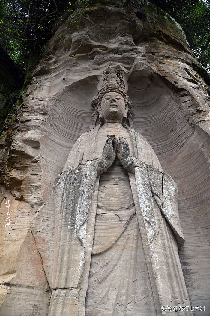 5#龛是毗卢佛龛,此龛凿于虎头山虎额“王”字部位,造像高6.3米,毗卢佛头戴宝冠,身穿袈裟,双手结内缚印,腕上的袈裟飘逸支撑双手;他微闭的双眸、含笑的嘴唇,显示出胸藏大千、大智、大能的神情和十足的教主风度。