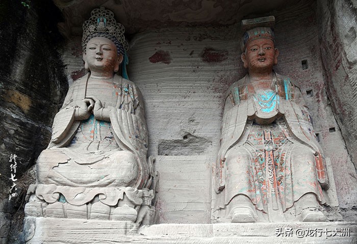 接下来看到的是1#龛——佛道合龛,此龛是明、清的造像龛左侧是佛教的毗卢佛(又称“大日如来”)与道教的东岳大帝(右侧)。毗卢佛结跏趺坐,施智拳印,头戴花冠;东岳大帝像双腿垂坐,头戴纯阳巾,整体造型与毗卢佛十分相似,只是面部略显呆板,根据东岳大帝像旁边的“道光二十二年(1842年)”的改刻题记,可知东岳大帝像是在晚清时才刻成,原先应该也是一尊佛像。
