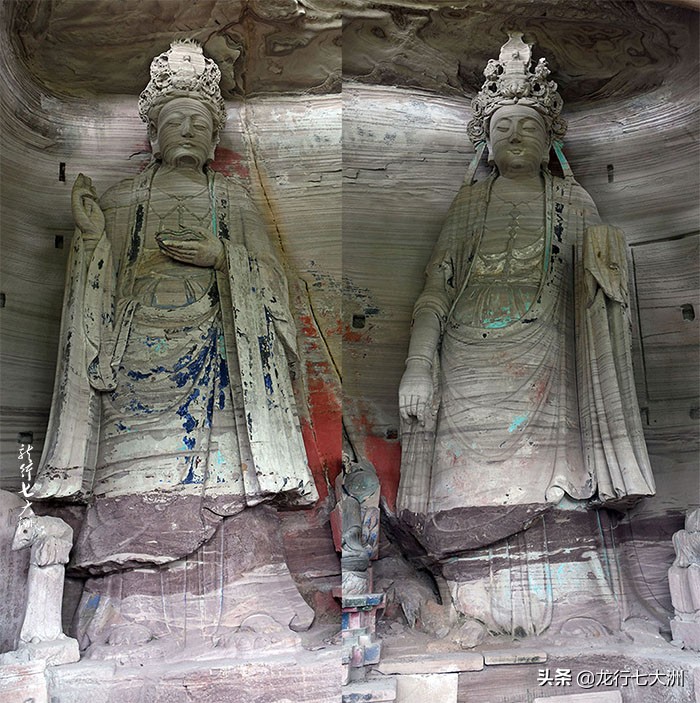 2#龛是观音菩萨和大势至菩萨的坐像龛。 观音菩萨头戴高花冠,冠中刻一阿弥陀佛立像,身着双领下垂大衣、披云肩、饰项圆、手镯、双手置腹前,五指并拢,捧一经箧,趺坐于仰莲台上,表现出阐释教义,弘扬佛法的气 度慑人心魄。大势至菩萨面相丰圆,头戴高花冠,冠中刻一宝塔,塔底层开小龛刻一小坐佛、服饰、坐姿得体,双手置腹 前捧一钵,仿佛盛满解救人间苦难的甘露。
