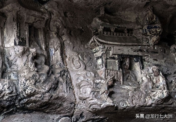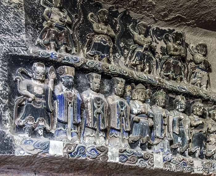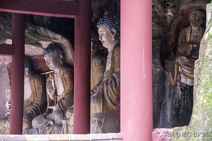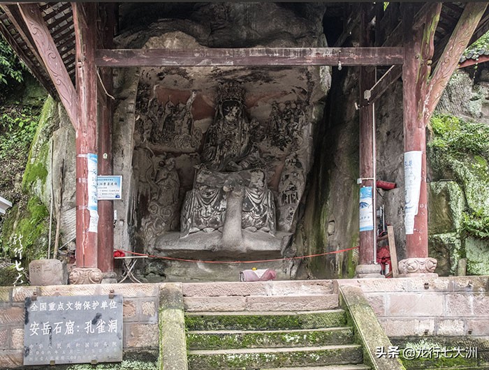 孔雀洞因主尊为孔雀明王而得名,其洞依岩而凿,高4.7米,宽4.3米,进深2.7米。这里有大小龛窟8个,造像75尊,碑刻题记6处,集中刻于孔雀洞、三佛洞、阿弥陀佛洞、观音经变龛和地狱变龛内。