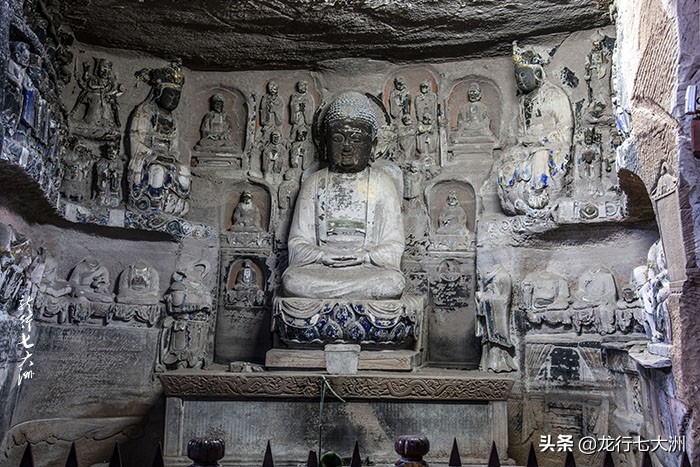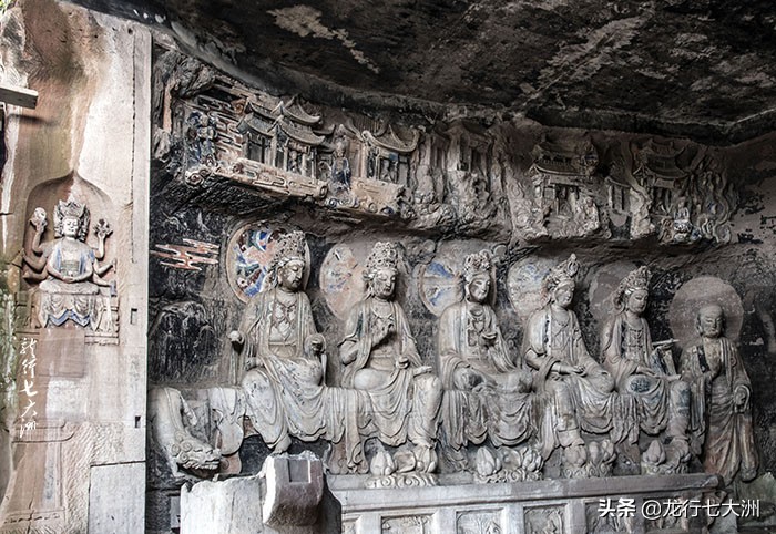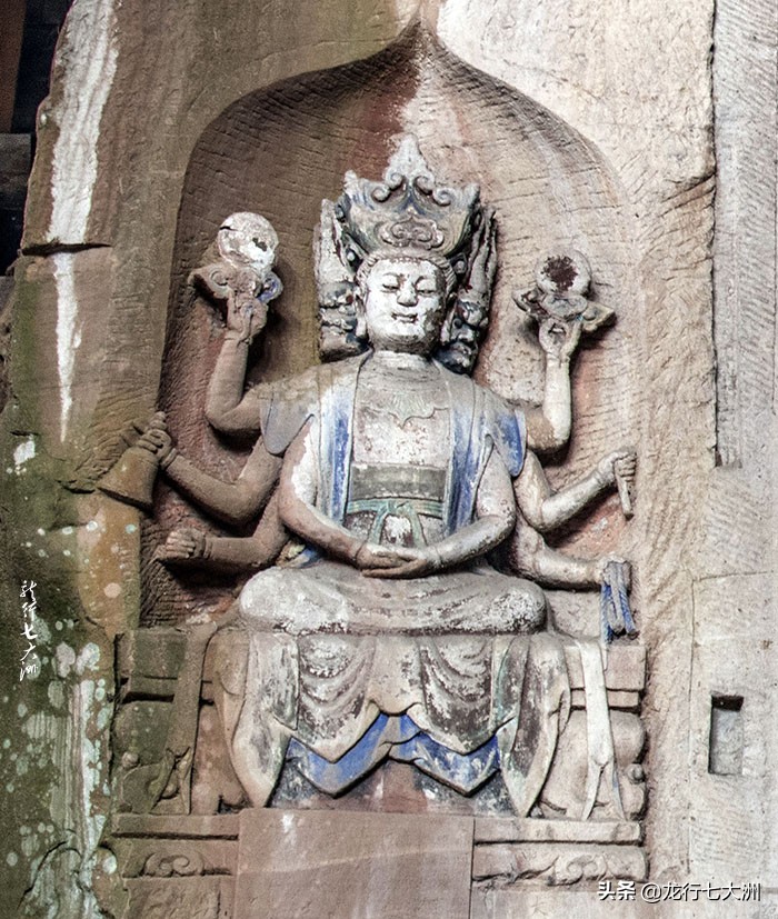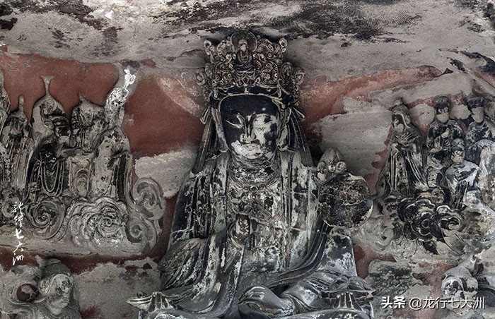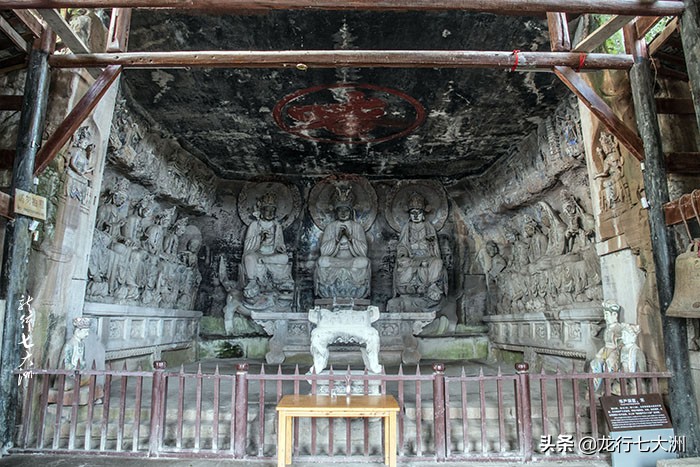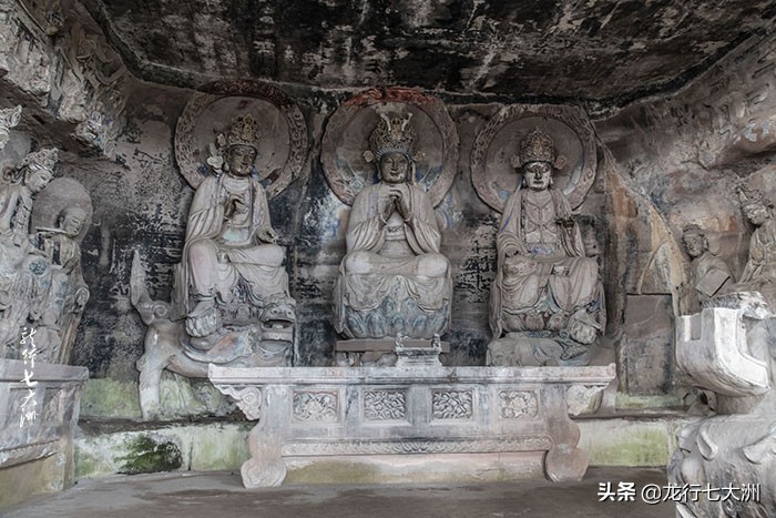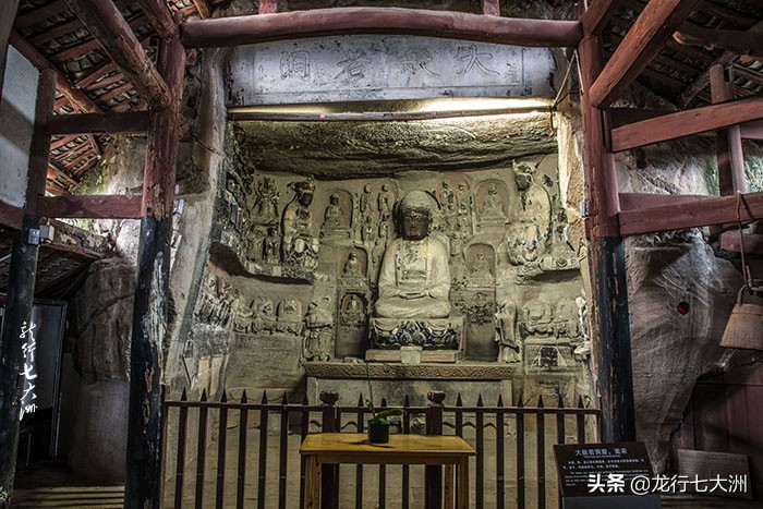 洞中有一仿木石刻的大供桌。在右壁第五和左壁第十菩萨座侧,一只下山猛虎,一只金毛吼狮,怒目圆瞪地守在洞口。在洞门左右两壁上还雕有三头六臂的准提佛母和八臂的摩利支天像,佛母前双手合十,后上双手各捧日、月,后下两手左持镜右握才印,才印上刻"仙佛同宗"四字,支天八臂各手分执日、月、玲、标、绳等法器,与佛母遥相对应,横眉怒目,把守洞窟出入口,守护法场。
